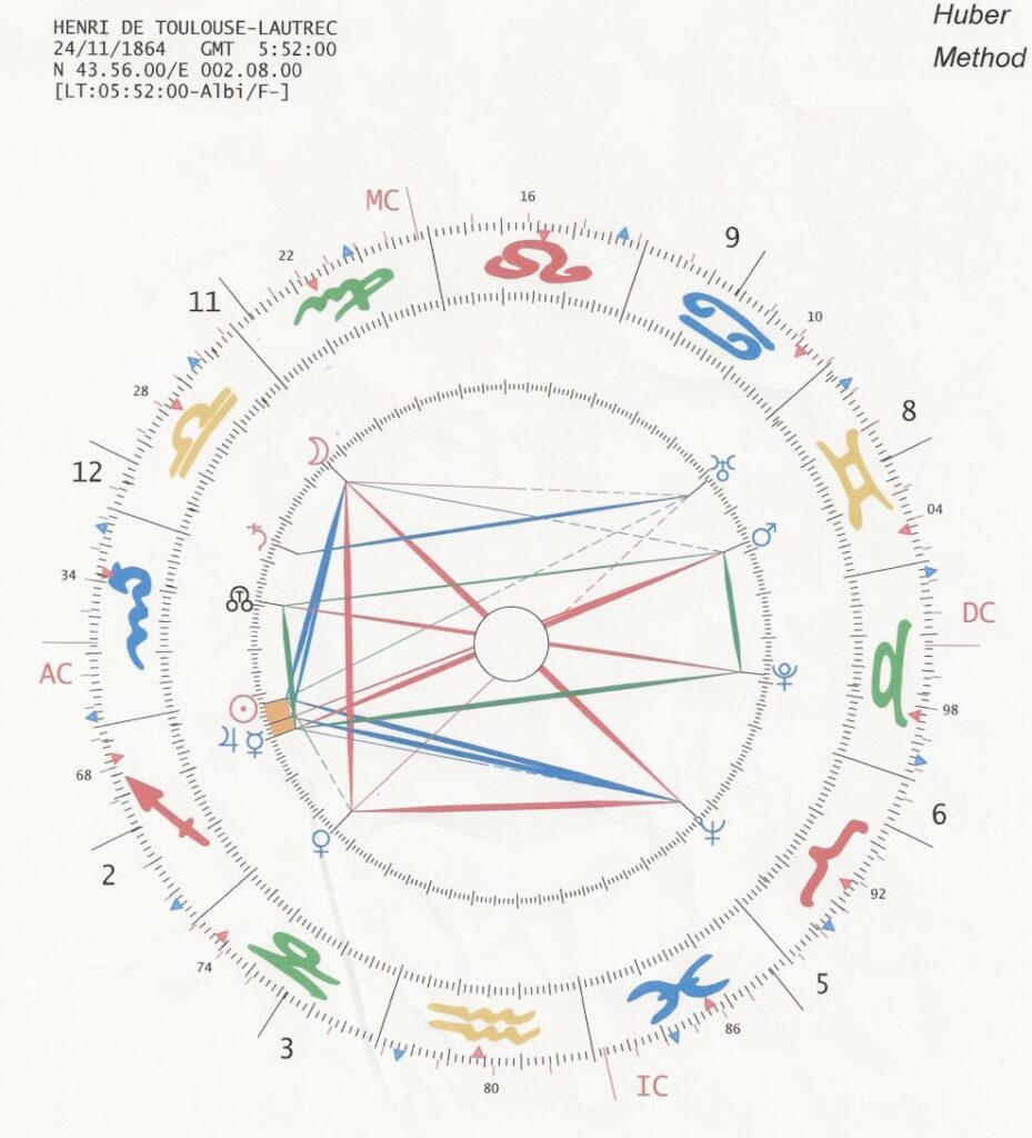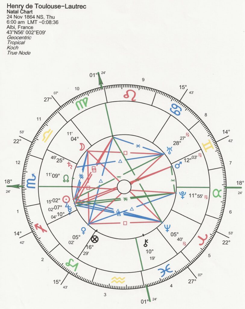 The short life of Henri de Toulouse-Lautrec, who died at the age of 36, was one that was full of physical and emotional suffering and also full of influential artistic creations.  For me this is an example of how astrology is only one of three elements that together create one’s life.  I call this the Three Circles where you visualize three interlocking circles representing Genetics, the Environment & Astrology.  The individual is found in the center area shared by all three circles.  Toulouse-Lautrec was born into an aristocratic family, with much potential offered in his astrological snapshot, but was never afforded the luxury of easy access to the inherent possibilities due to the inbreeding within his family.  Henri and his cousins suffered chronic illnesses and related physical ailments which contributed to his diminished height and the emotional suffering that led to his early death from alcohol and syphilis.  Though presenting himself as a witty, fun man about town, Toulouse-Lautrec suffered greatly due to his physical ailments as well as past family trauma.  His father never accepted his son’s decision to become a professional artist. Toulouse-Lautrec turned to alcohol to deal with his pain and would ultimately drink himself into oblivion. He had a nervous breakdown in 1899 after his mother, whom he was close to, decided to leave Paris, and the artist was committed to a sanitarium for several months.