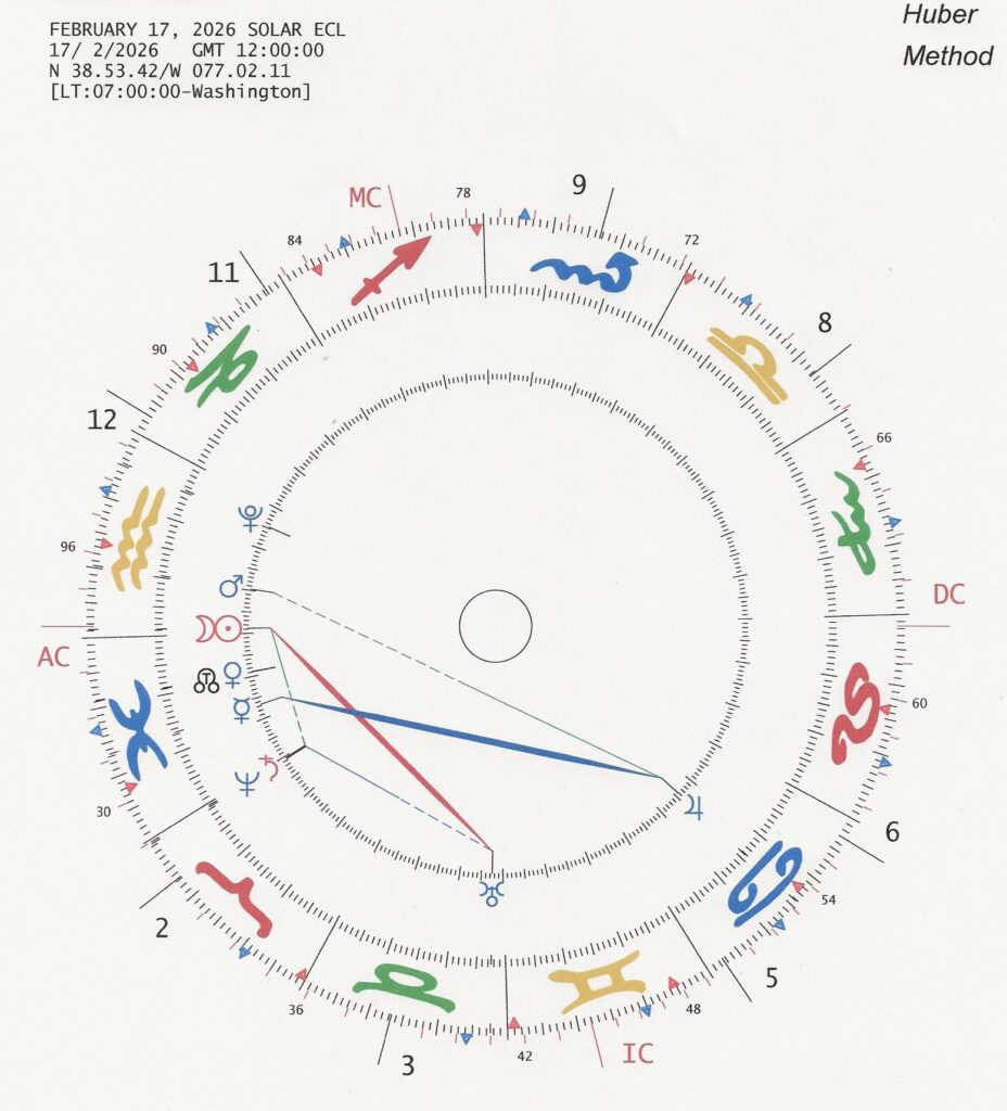 The Sun, Mars and Saturn join in conjunction on January 18 at 27 degrees Capricorn directly conjunct to Pluto in the USA Sibley chart, just as Venus comes into conjunction with Pluto. This could feel like an aggressive attack on the political structures. Then, just prior to the February Eclipse, Neptune reenters Aries for 13 years on January 27, 2026 heralding the Collective desire and dream to actively pursue what can be almost a spiritual blend of vision and ideals. Will people finally feel enough confidence to voice their individual positions in a bold action-oriented manner? On that same day, January 27, Mars conjuncts Pluto giving aggressiveness to the Aquarian urge. Saturn’s recent retrograde back into Pisces has seemed to mute the efforts to effect structural change, but it goes direct on November 28 and reaches Aries on February 15, 2026 just in time for the February Solar Eclipse. This can give concrete form to the concept that purposeful action is also the responsible thing to do.
