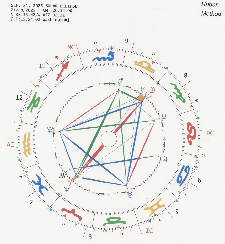 The following is a discussion of what the mundane impacts might be as we move from the eclipse of September 21, 2025 to the next eclipse coming on February 17, 2026. I have been uncertain how the impacts from the partial Solar Eclipse on September 21, with the Sun and Moon at 29 Virgo, were going to work out. As others have pointed out, the Talent Triangle involving the outer planets Uranus, Neptune & Pluto speak to three different ways that society norms can be supervened through vision, faith and action (respectively). All three transpersonals are tightly aspected to the eclipsing Sun and Moon, creating a Kite Figure. They are all poised to be able to work together, but need energy from squares and oppositions, as well as what can be interjected through passing transits, in order to create real change. I am confident that big changes are on the way but now, more clearly, see that there is going to be a continual build-up of tension and hopefully action leading up to a culmination coming with the Solar Eclipse of February 17, 2026. That eclipse has the Sun/Moon directly on the Ascendent in the chart drawn for Washington DC. Much will be discussed regarding that eclipse as we come closer in time to it.