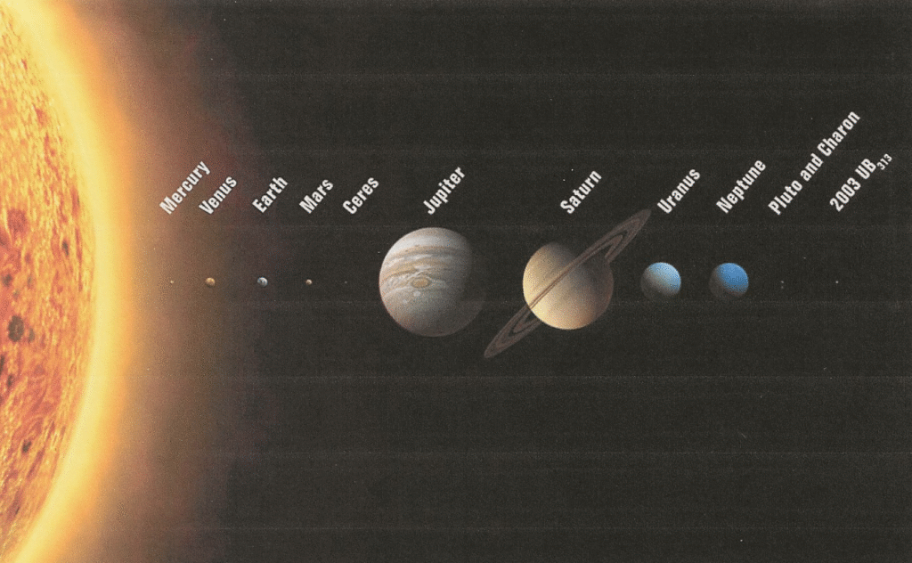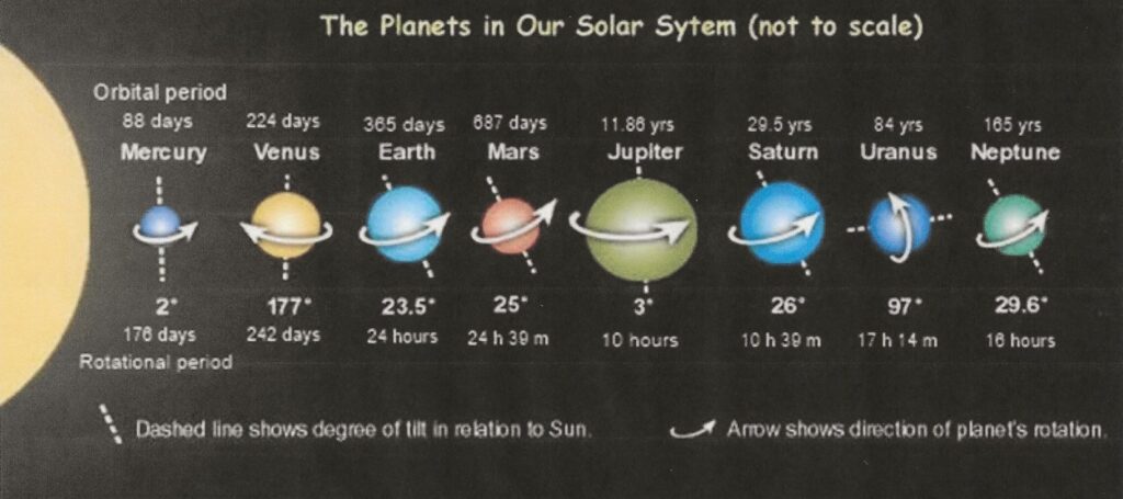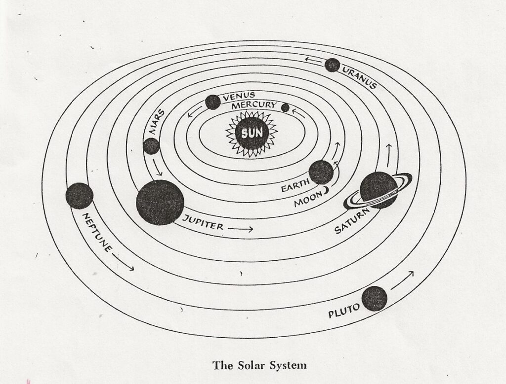 First, we need to understand the system that we are working with. Our view is from Earth. From our position on the face of the earth we are able to look at and thru the Sun to one part of our solar system and the stars beyond. We can also look away from the sun (or thru the nighttime sky) to the other “side” of our solar system and to the stars beyond. Can you visualize yourself standing outside the solar system, possibly near Sirius or some other close star, looking in, and picture the actual physical structure of the solar system? It would look like the graph below. The scale is not correct but the planets are in their correct placements outwards from the Sun.The scale is not correct but the planets are in their correct placements outwards from the Sun.