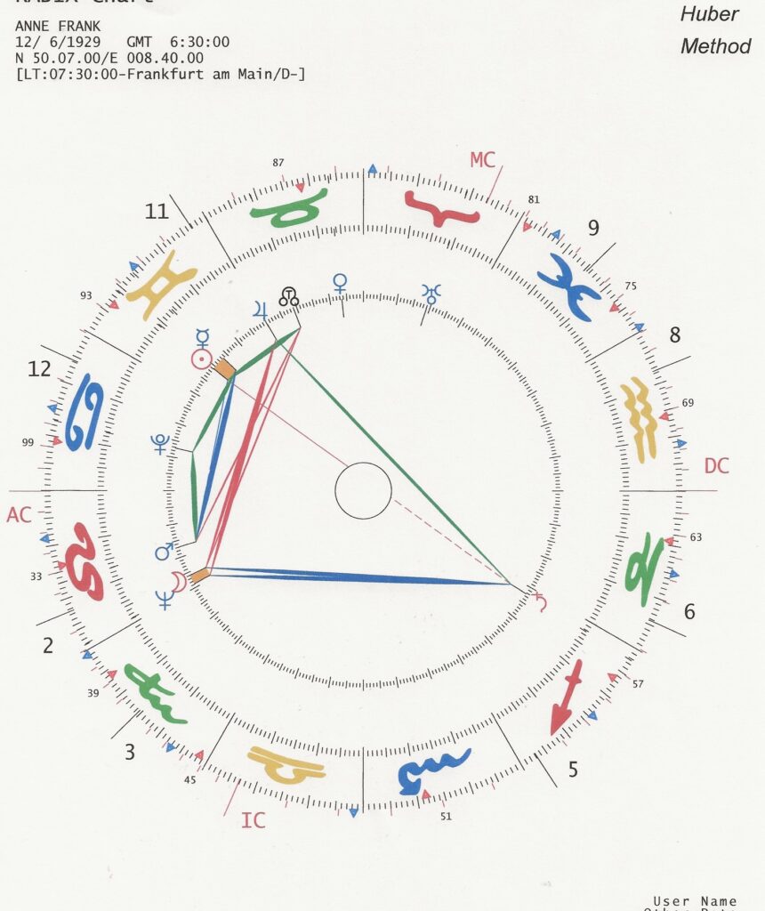 Another example is the Pluto in Anne Frank’s Inner Chart. I consider the semi-sextile aspects as being active so that Pluto is not unaspected in my work. I view Pluto as part of an EYE figure, which is part of a Magic Cap Figure in her Inner Chart. As the apex of the EYE, Pluto is the basic theme and focal point for all the information that is being gtathered by the EYE rim planets Sun/Mercury and Mars. I find this a much better description of what was going on in that 12th house attic she was living in than to try to explain it by describing the Pluto as unaspected. Here is that chart: