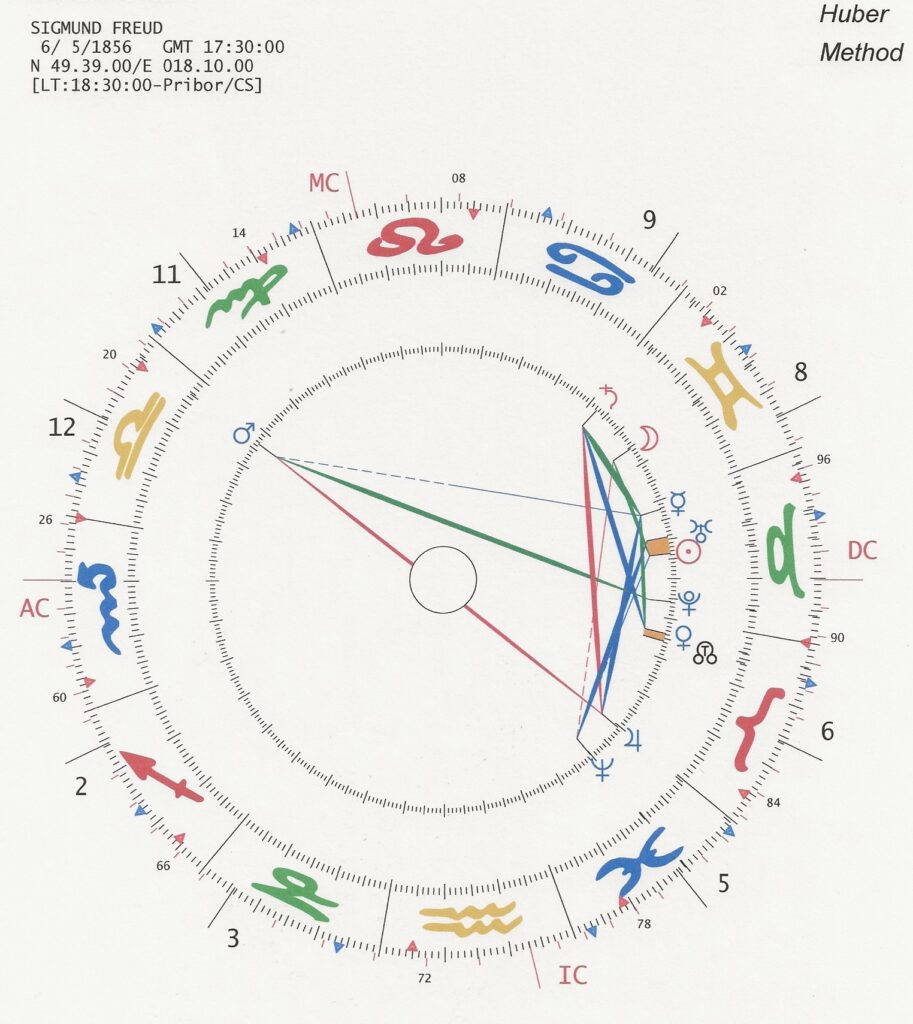 Below you will find descriptions of each planet when unaspected as offered by two different astrologers. I have decided to offer the information on unaspected planets here instead of in the appendix of my book. Before providing that information, I would like to discuss the concept of “feral” planets. Some astrologers will consider planets unaspected by also not including any out of sign aspects. And some will only use the Ptolemaic aspects, which do not include the semi-sextile aspect. They call these “feral” planets. An example is Mars in Sigmund Freud’s Inner Chart which would be a feral unaspected planet because all three aspects to it, the trine to Mercury, the opposition to Saturn and the quincunx to Pluto are out of sign aspects. I do not consider it unaspected. There is a significant difference in explanation with Mars if, in one case it is considered essentially untethered or unbounded, while in the other case it has clear and specific aspectural relationships with three other planets. Here is that chart: